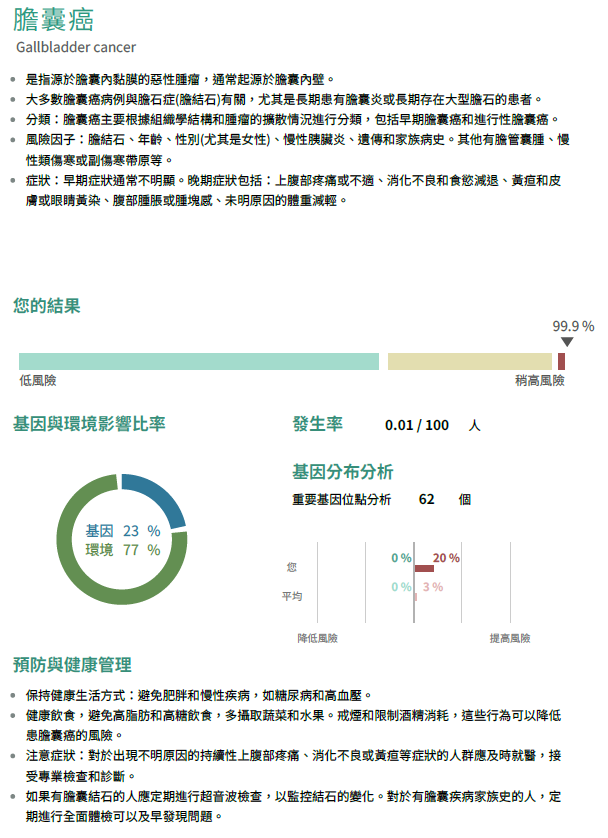 全面癌症基因檢測,協助了解自身是否帶有癌症弱勢基因,透過醫師、營養師、健康管理師等專業協助,加強癌症篩檢頻率與良好生活習慣建立,降低罹癌風險,並有機會早期發現早期治療。