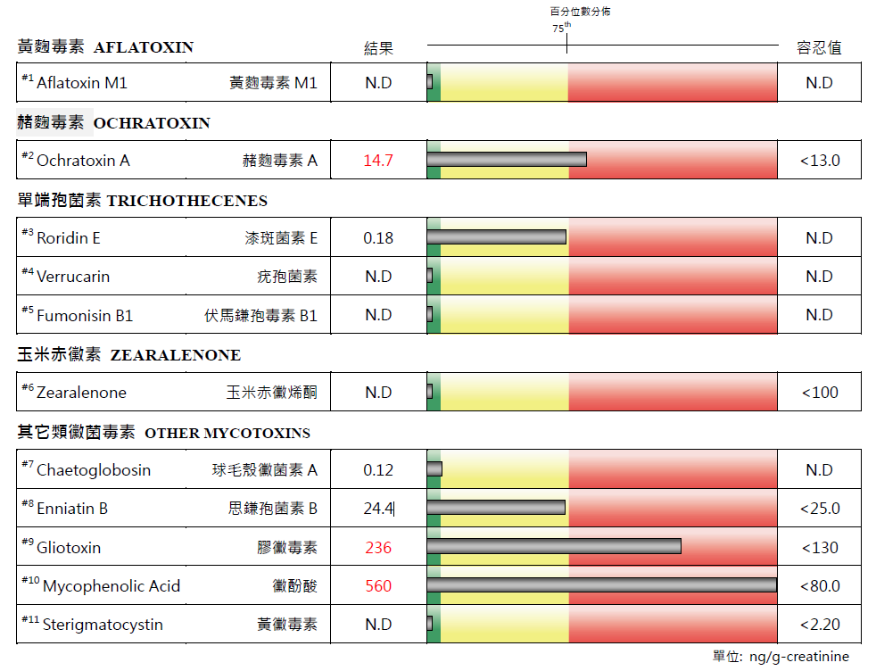 黴菌毒素是環境中常見且危險的毒素之一,它們可能存在於食物中,也可能隱藏在家中。黴菌毒素可能會導致不舒服的急性和慢性症狀、免疫系統受損和嚴重的健康問題。因此藉由分析十一種不同的黴菌毒素濃度,包括最具毒性的黴菌代謝物:黃麴毒素、赭麴毒素、單端孢菌素和其它黴菌毒素等,了解是否需進行黴菌毒素排除並控制生活中黴菌毒素的暴露風險,以幫助恢復理想的健康體質。