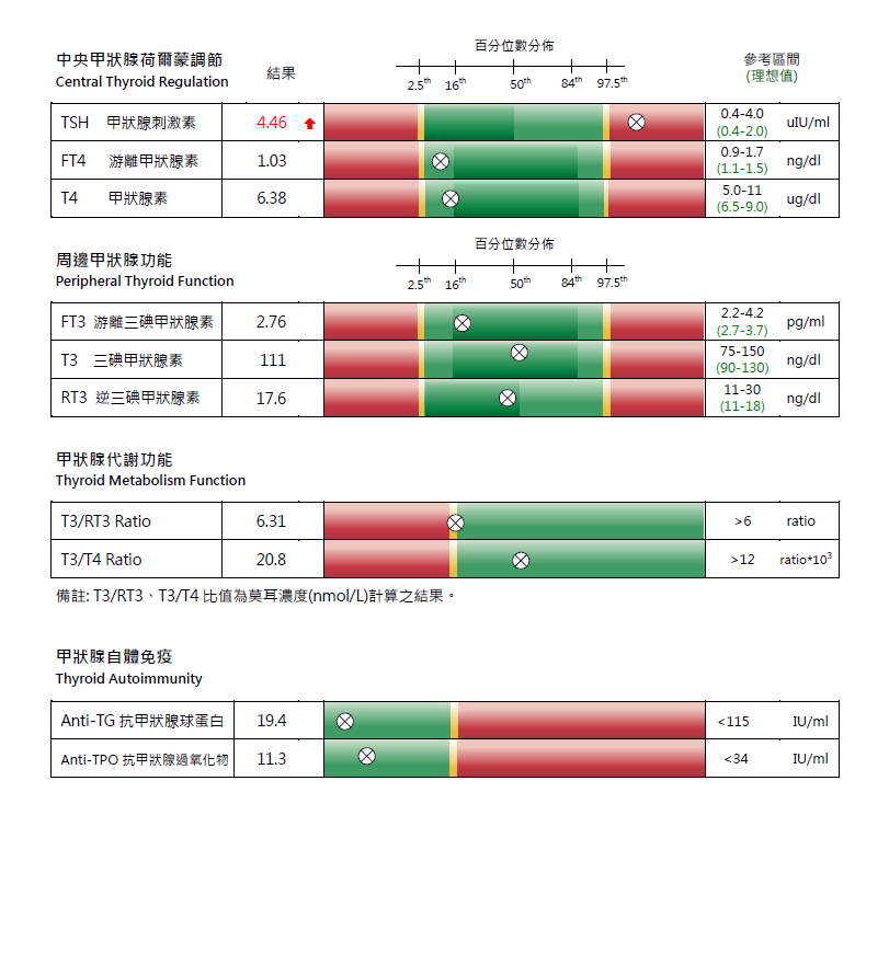 此檢測針對甲狀腺荷爾蒙代謝進行完整分析,包括:中樞甲狀腺控制及活性、荷爾蒙製造及分泌、週邊甲狀腺素轉換及自體免疫抗體,助於評估甲狀腺荷爾蒙不平衡所導致的慢性疾病。